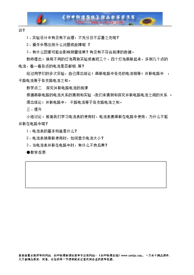 2、会分析实验数据,归纳总结出串联电路、并联电路各电流的规律 。