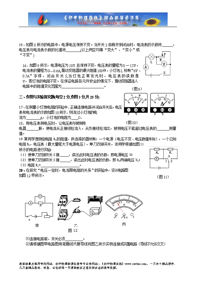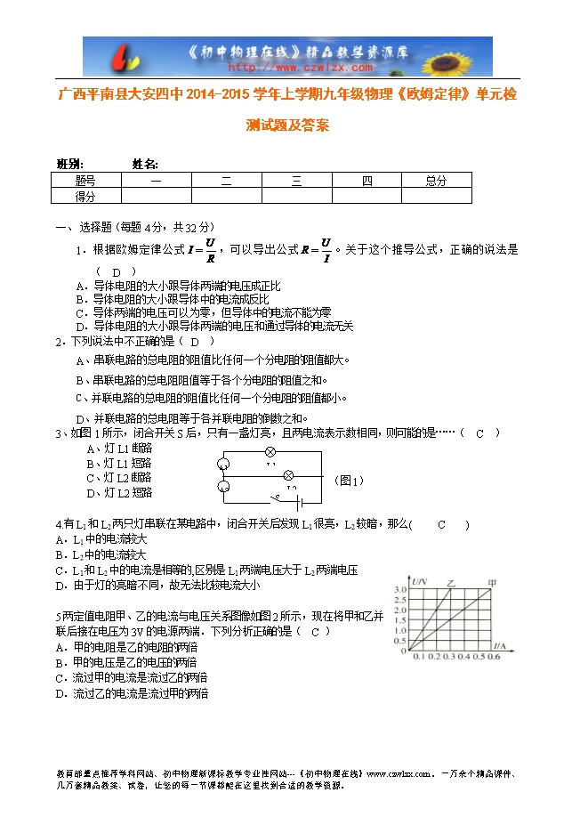 广西平南县大安四中2014-2015学年上学期九年级物理《欧姆定律》单元检测试题及答案