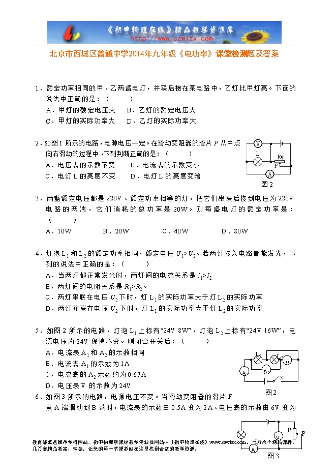 北京市西城区普通中学2014年九年级《电功率》课堂检测题及答案