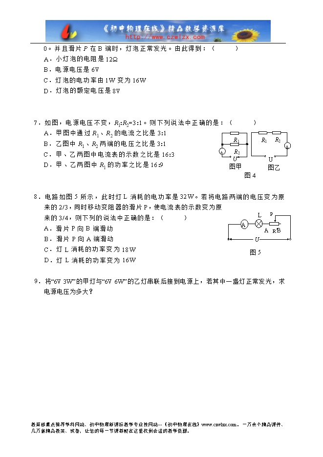 【内容简介】1.额定功率相同的甲、乙两盏电灯,并联后接在某电路中,乙灯比甲灯亮。下面的说法中正确的是:( )