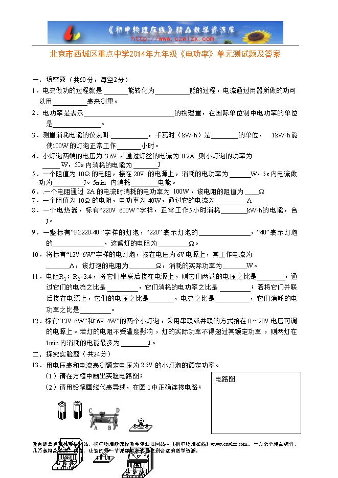 北京市西城区重点中学2014年九年级《电功率》单元测试题及答案