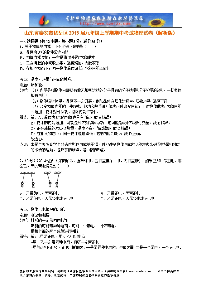 山东省泰安市岱岳区2015届九年级上学期期中考试物理试卷(解析版)