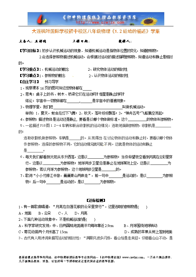 大连枫叶国际学校初中校区八年级物理《1.2运动的描述》学案
