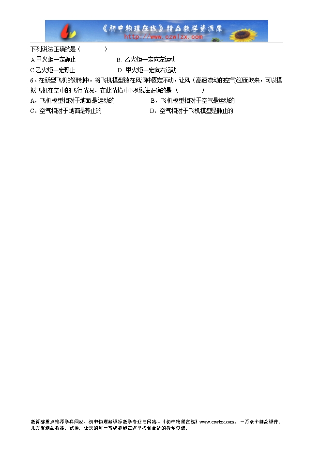 4、参照物:描述物体是运动还是静止, 要看是以哪个物体做标 准。这个 的物体叫参照物。