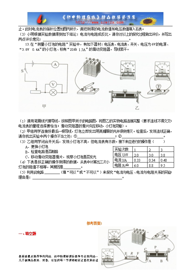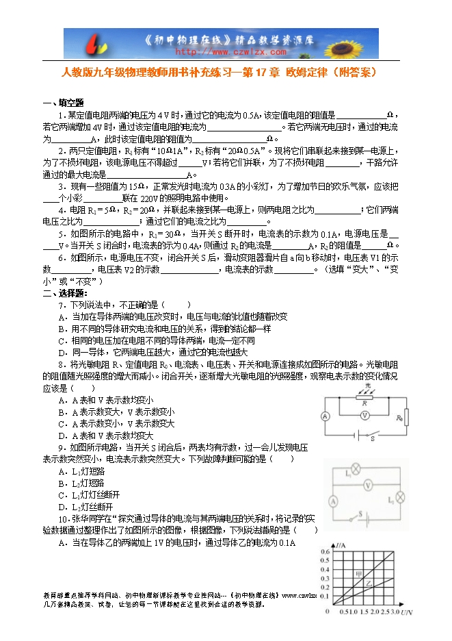 人教版九年级物理教师用书补充练习--第17章 欧姆定律(附答案)