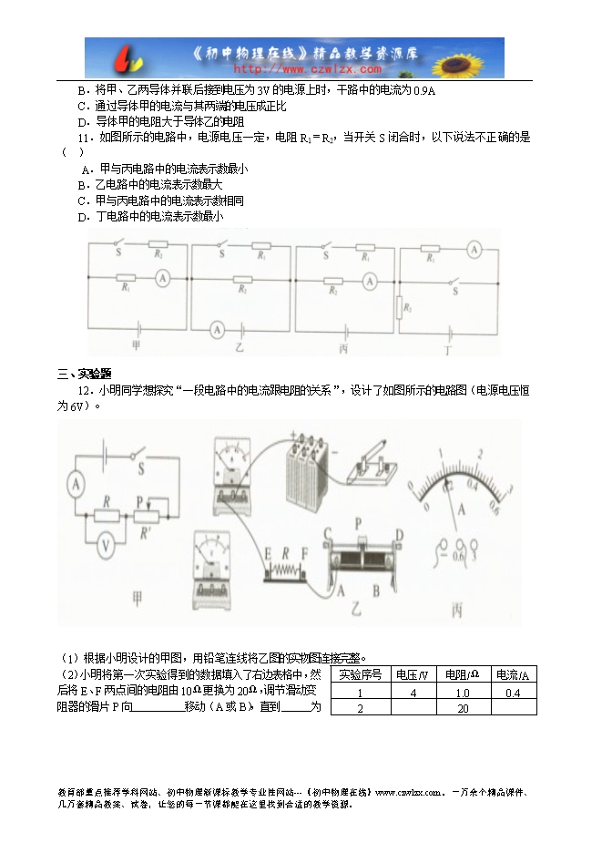 2.两只定值电阻,R1标有“10Ω1A”,R2标有“20Ω0.5A”。现将它们串联起来接到某一电源上,为了不损坏电阻,该电源电压不得超过 V;若将它们并联,为了不损坏电阻 ,干路允许通过的最大电流是 A。