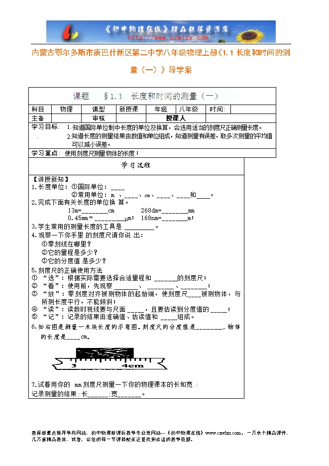 内蒙古鄂尔多斯市康巴什新区第二中学八年级物理上册《1.1长度和时间的测量(一)》导学案