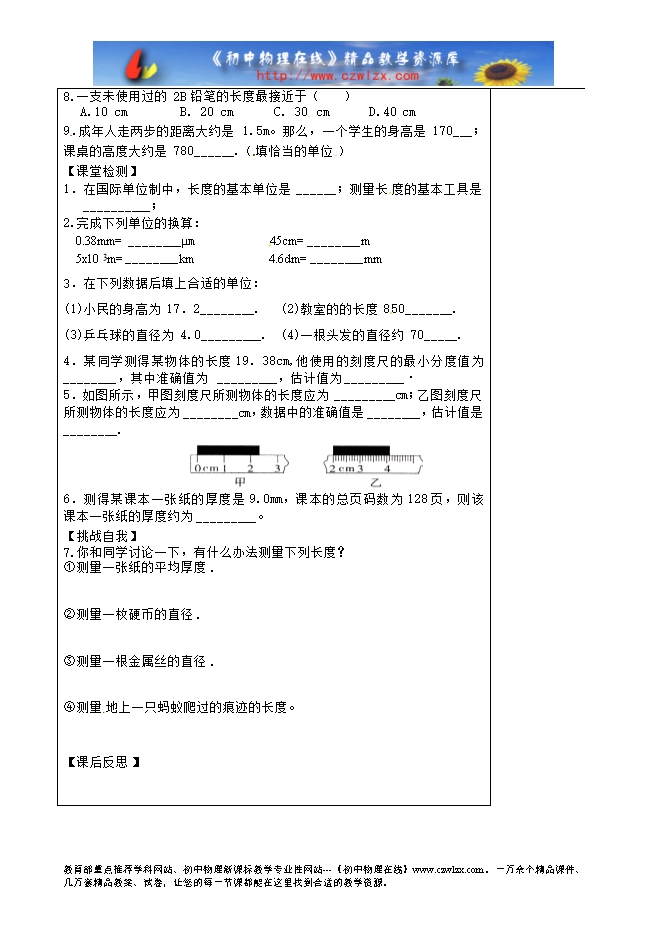 2.知道长度的测量结果由数值和单位组成,知道测量有误差,取多次测量的平均值可以减小误差。