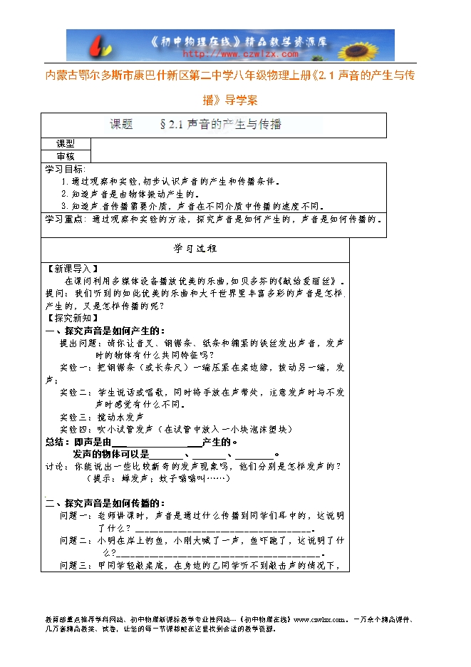 内蒙古鄂尔多斯市康巴什新区第二中学八年级物理上册《2.1声音的产生与传播》导学案