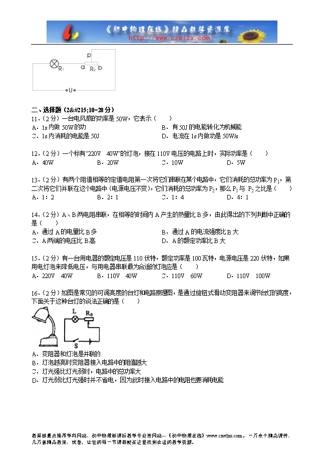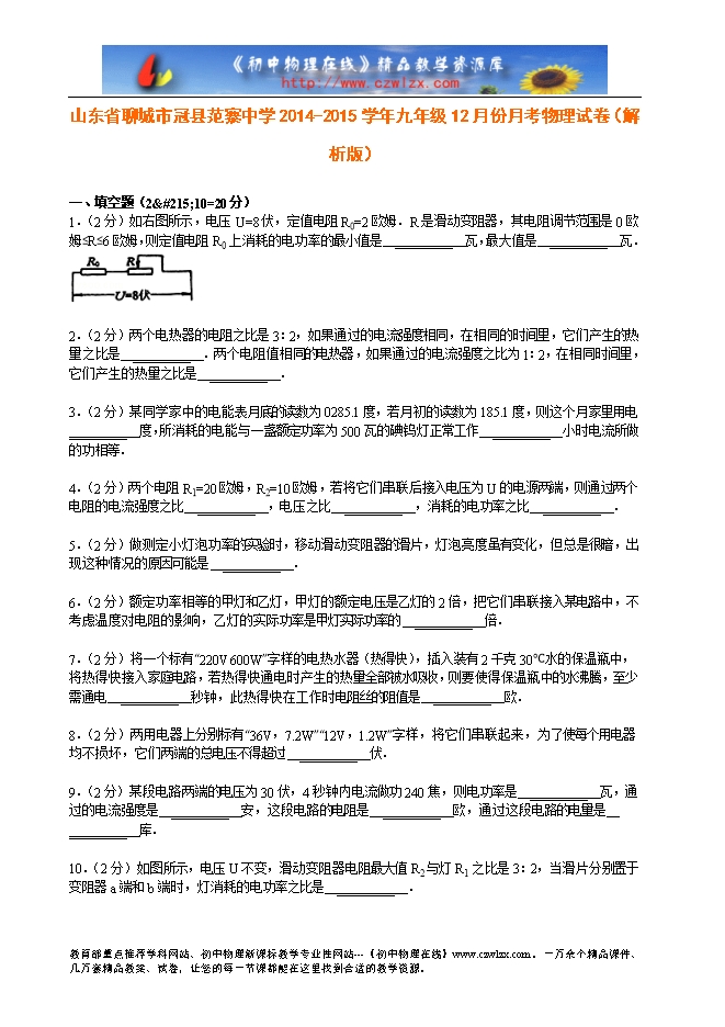 1.(2分)如右图所示,电压U=8伏,定值电阻R0=2欧姆.R是滑动变阻器,其电阻调节范围是0欧姆≤R≤6欧姆,则定值电阻R0上消耗的电功率的最小值是 _________ 瓦,最大值是 _________ 瓦.