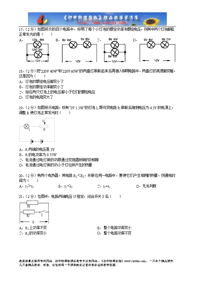 2.(2分)两个电热器的电阻之比是3:2,如果通过的电流强度相同,在相同的时间里,它们产生的热量之比是 _________ .两个电阻值相同的电热器,如果通过的电流强度之比为1:2,在相同时间里,它们产生的热量之比是 _________ .