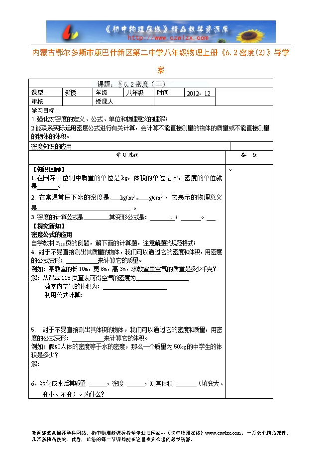 内蒙古鄂尔多斯市康巴什新区第二中学八年级物理上册《6.2密度(2)》导学案