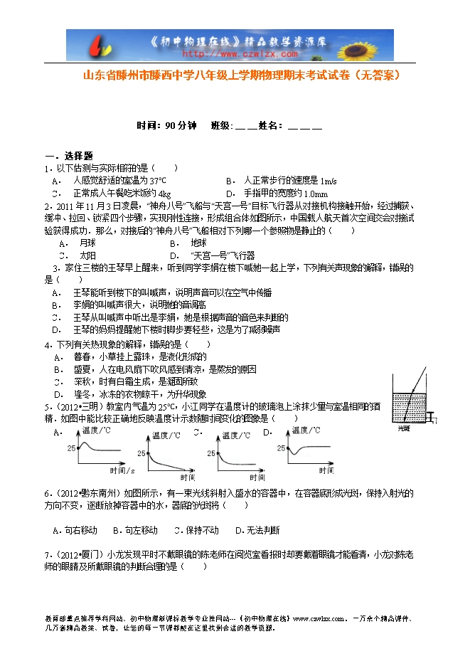 山东省滕州市滕西中学八年级上学期物理期末考试试卷(无答案)