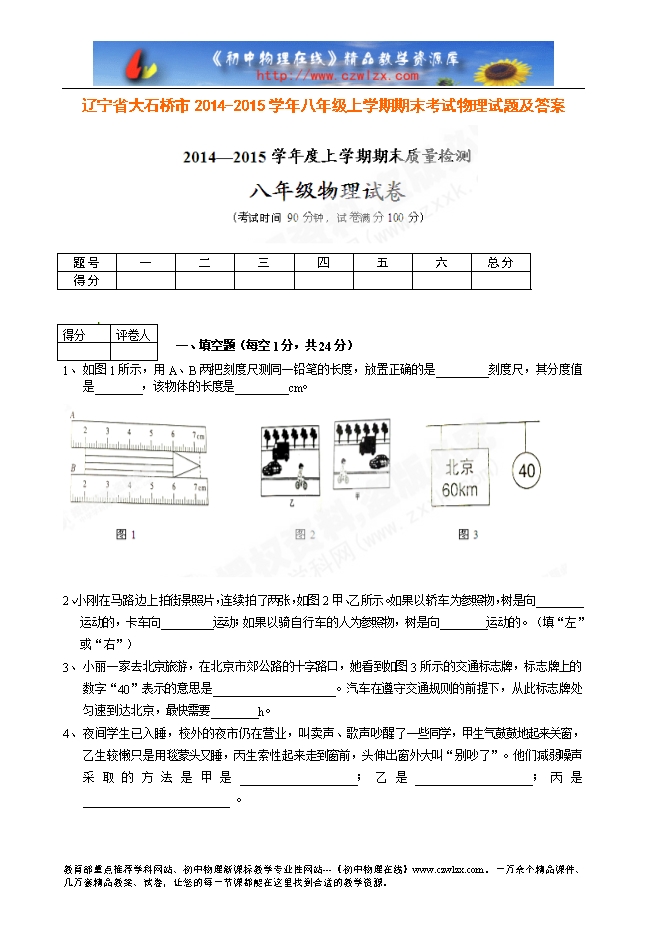 辽宁省大石桥市2014-2015学年八年级上学期期末考试物理试题及答案