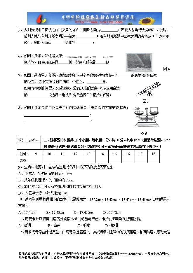 6、如图4所示,彩虹是太阳光通过空中的小水滴经过______后形成 的彩色光谱,红色光弧在最______侧,紫色光弧在最______侧。