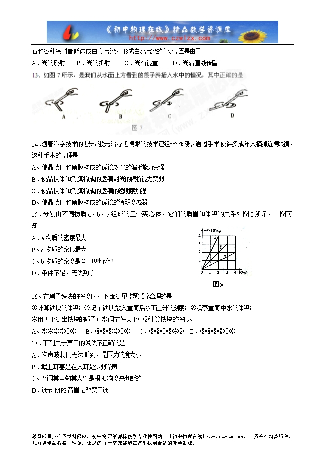 4、夜间学生已入睡,校外的夜市仍在营业,叫卖声、歌声吵醒了一些同学,甲生气鼓鼓地起来关窗,乙生较懒只是用毯蒙头又睡,丙生索性起来走到窗前,头伸出窗外大叫“别吵了”。他们减弱噪声采取的方法是甲是____________________;乙是____________________;丙是_________________________ 。