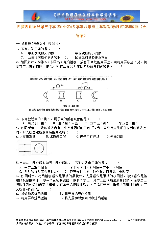 内蒙古化德县第三中学2014-2015学年八年级上学期期末测试物理试题(无答案)