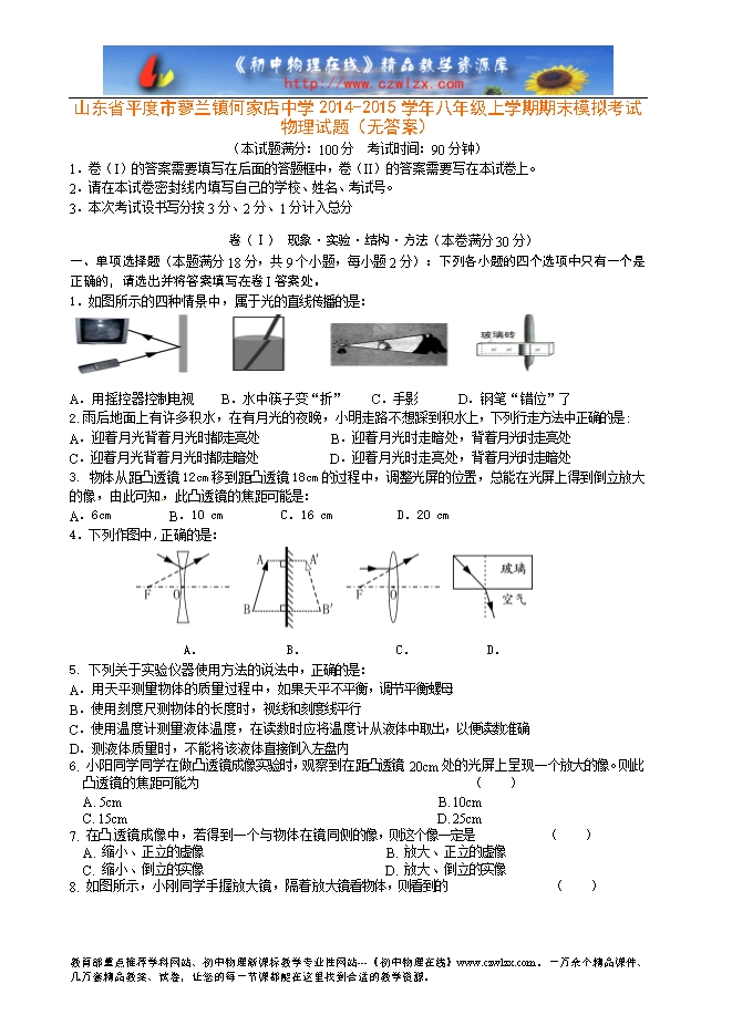 山东省平度市蓼兰镇何家店中学2014-2015学年八年级上学期期末模拟考试物理试题(无答案)
