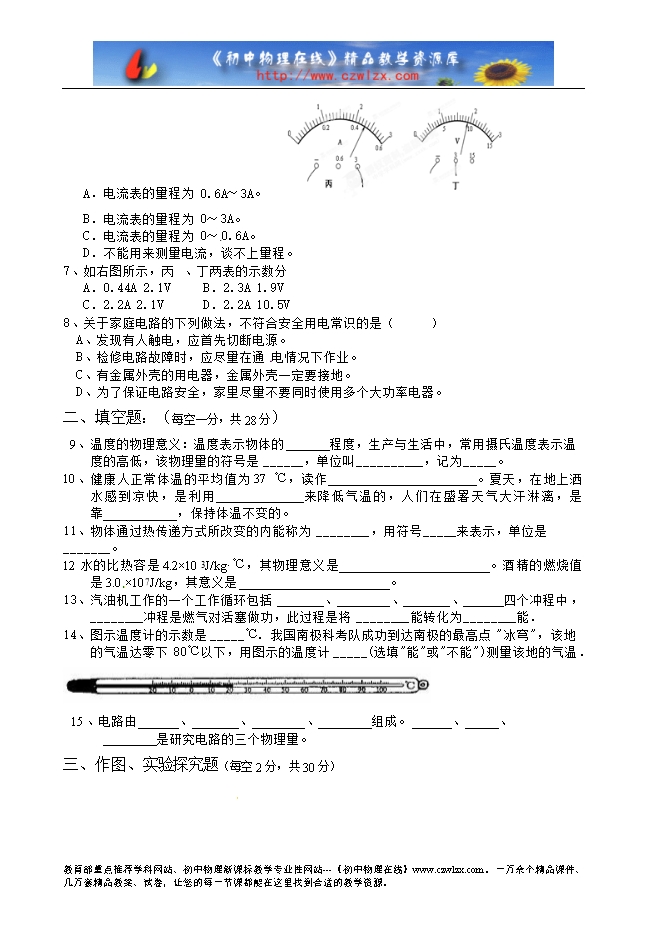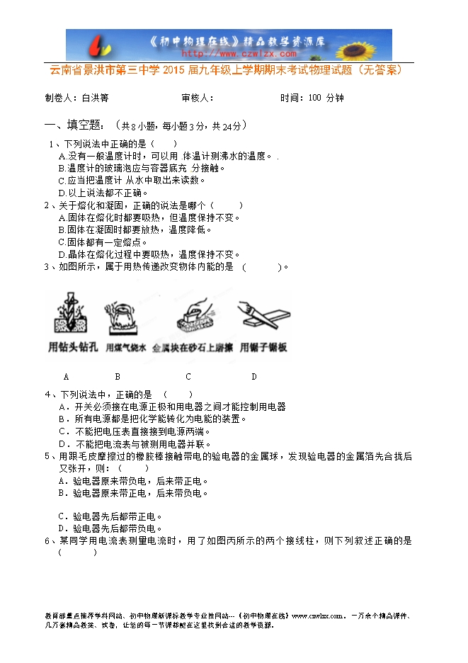 云南省景洪市第三中学2015届九年级上学期期末考试物理试题(无答案)