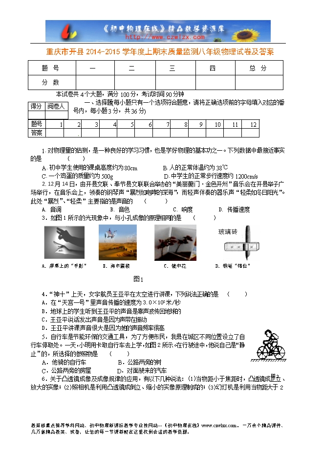 重庆市开县2014-2015学年度上期末质量监测八年级物理试卷及答案