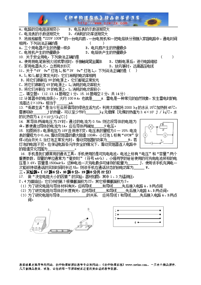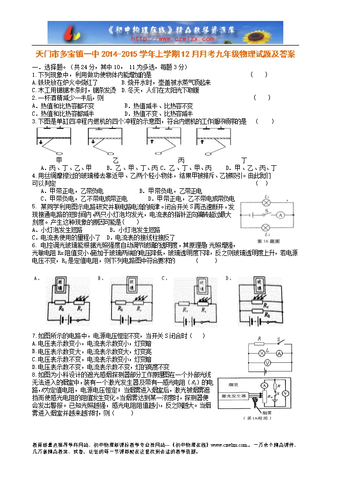 天门市多宝镇一中2014-2015学年上学期12月月考九年级物理试题及答案
