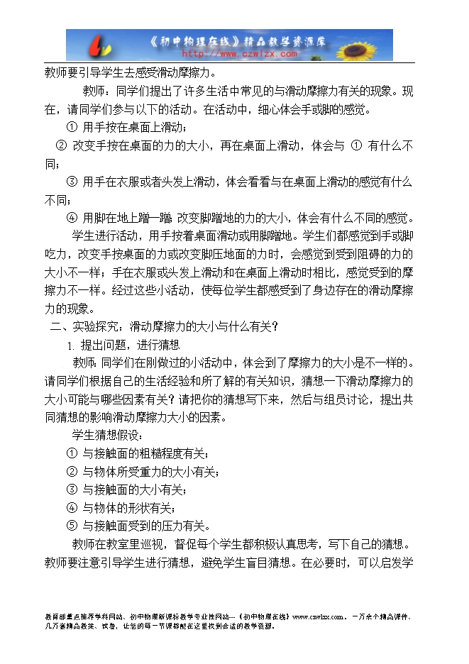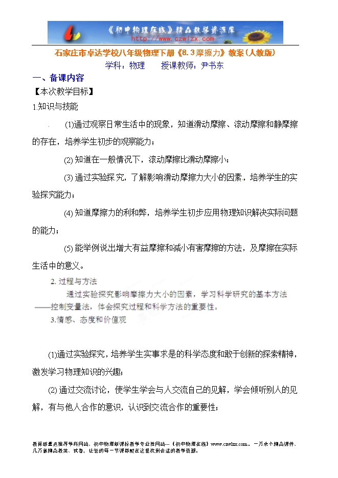 (4) 知道摩擦力的利和弊,培养学生初步应用物理知识解决实际问题的能力;