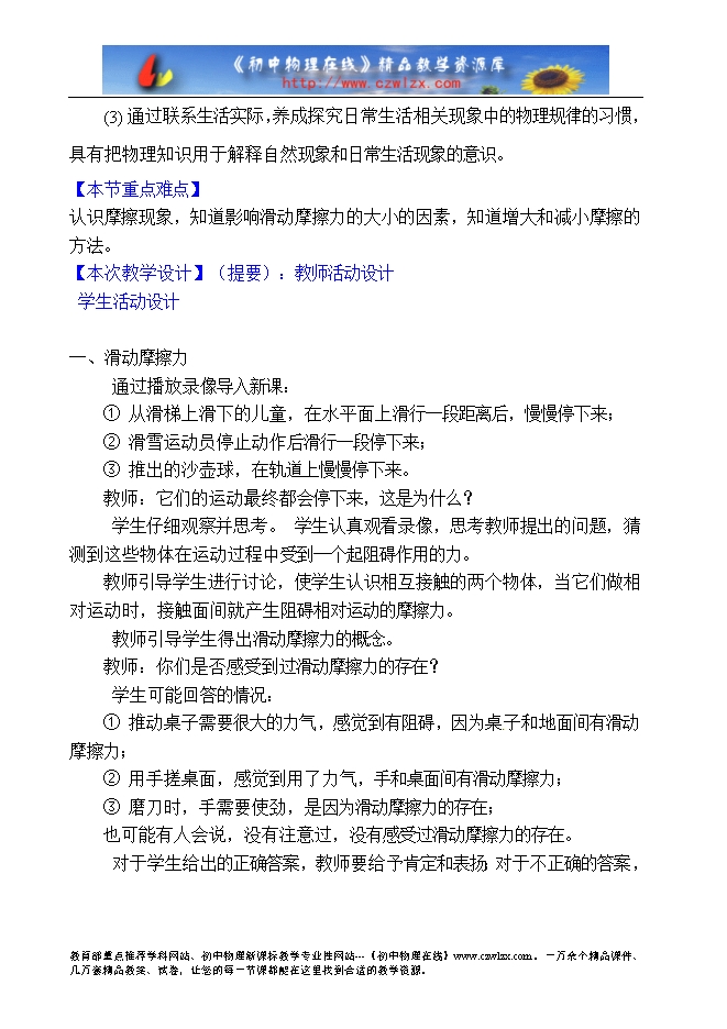 (1)通过观察日常生活中的现象,知道滑动摩擦、滚动摩擦和静摩擦的存在,培养学生初步的观察能力;
