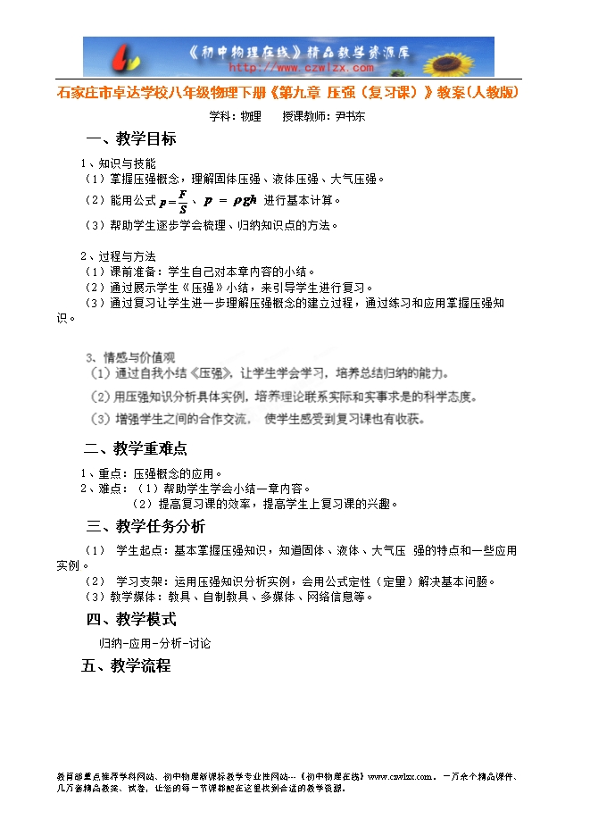 石家庄市卓达学校八年级物理下册《第九章 压强(复习课)》教案(人教版)