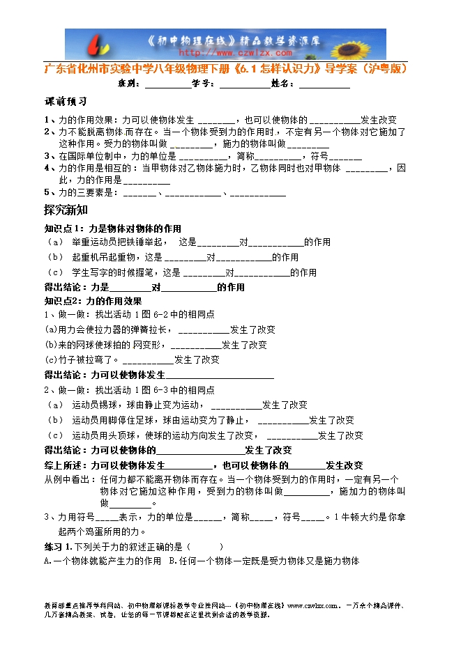 广东省化州市实验中学八年级物理下册《6.1怎样认识力》导学案(沪粤版)