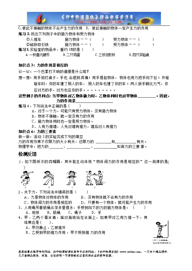 4、 力的作用是相互的:当甲物体对乙物体施力时,乙物体同时也对甲物体_________,因此,力的作用是__________