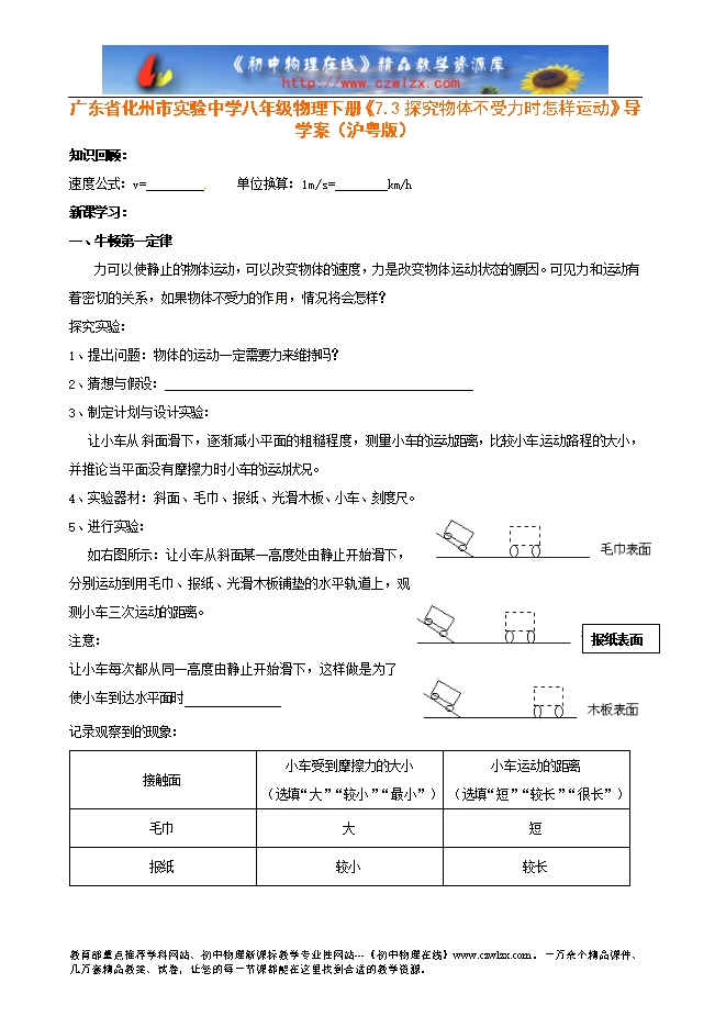 广东省化州市实验中学八年级物理下册《7.3探究物体不受力时怎样运动》导学案(沪粤版)