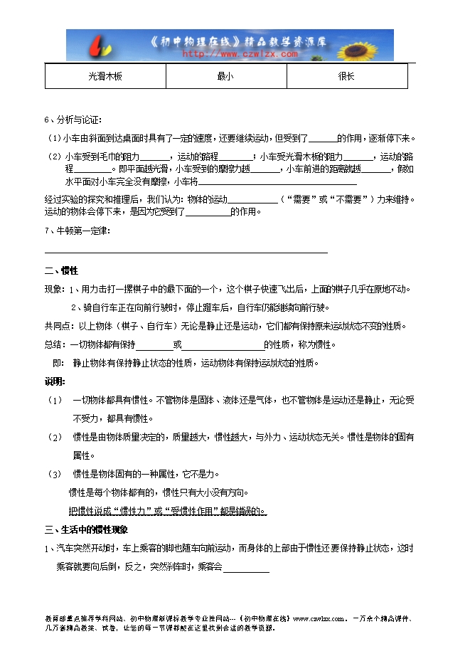 4、实验器材:斜面、毛巾、报纸、光滑木板、小车、刻度尺。