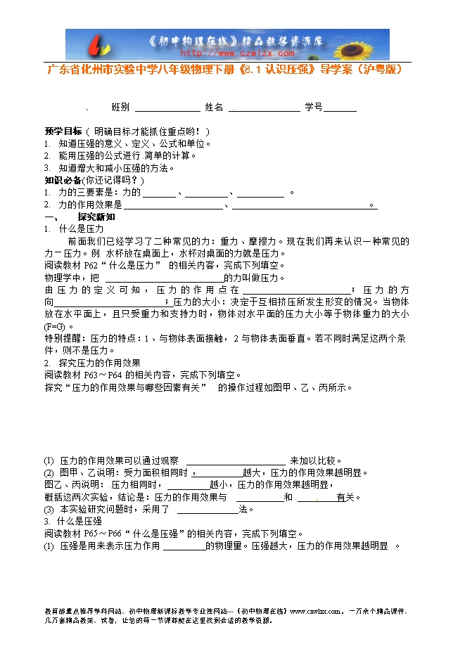 广东省化州市实验中学八年级物理下册《8.1认识压强》导学案(沪粤版)