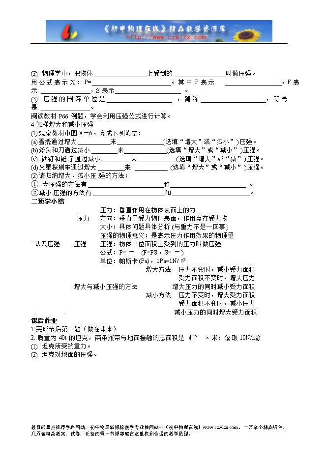阅读教材P62“什么是压力” 的相关内客,完成下列填空。