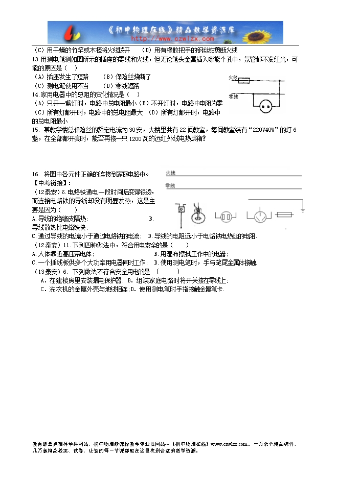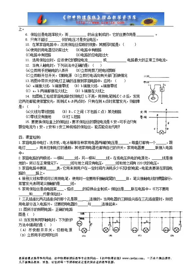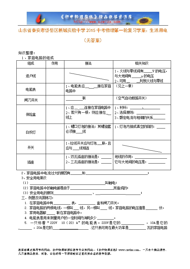 山东省泰安市岱岳区新城实验中学2015中考物理第一轮复习学案:生活用电(无答案)