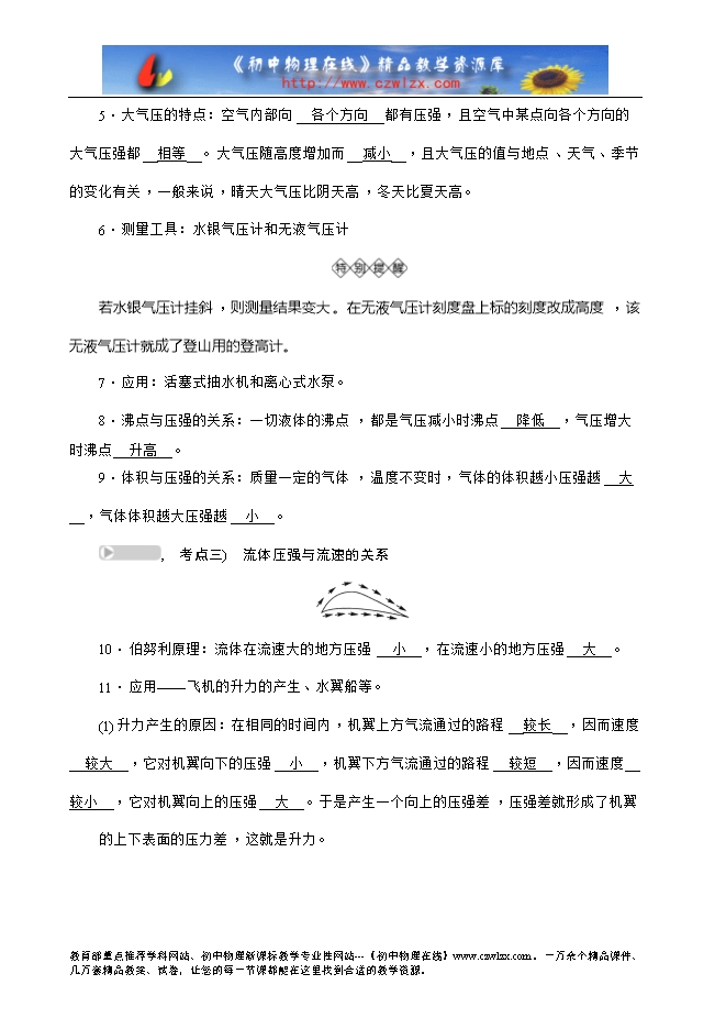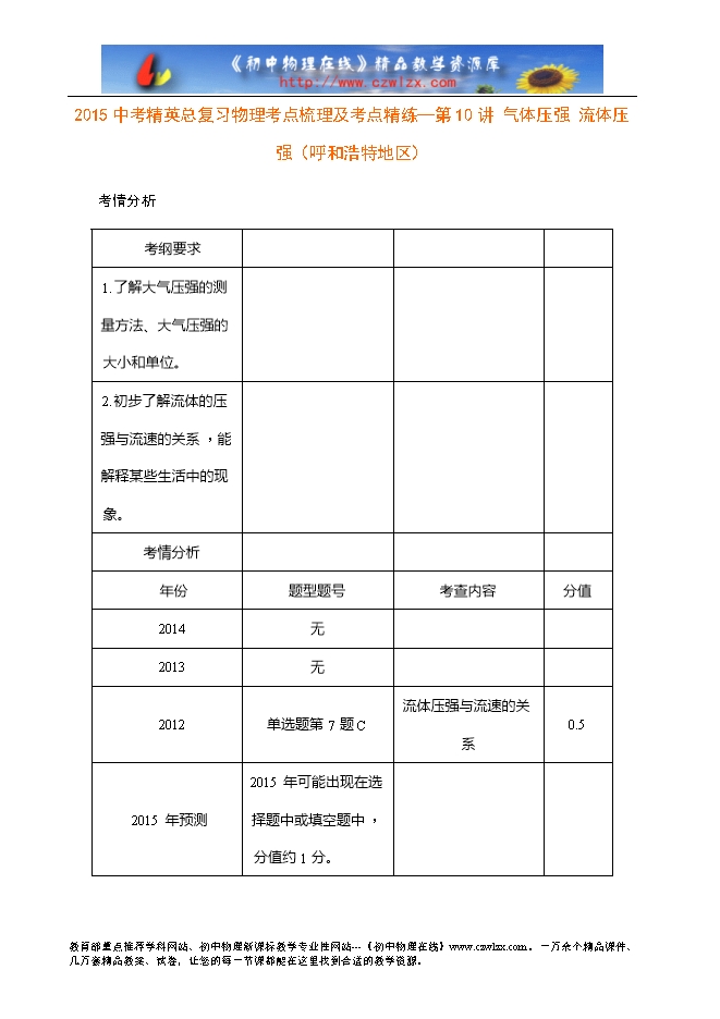 2015中考精英总复习物理考点梳理及考点精练—第10讲 气体压强 流体压强(呼和浩特地区)