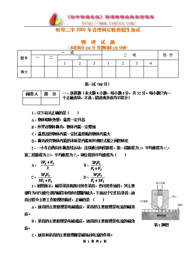 蚌埠二中2005年省理科实验班招生物理试题及答案