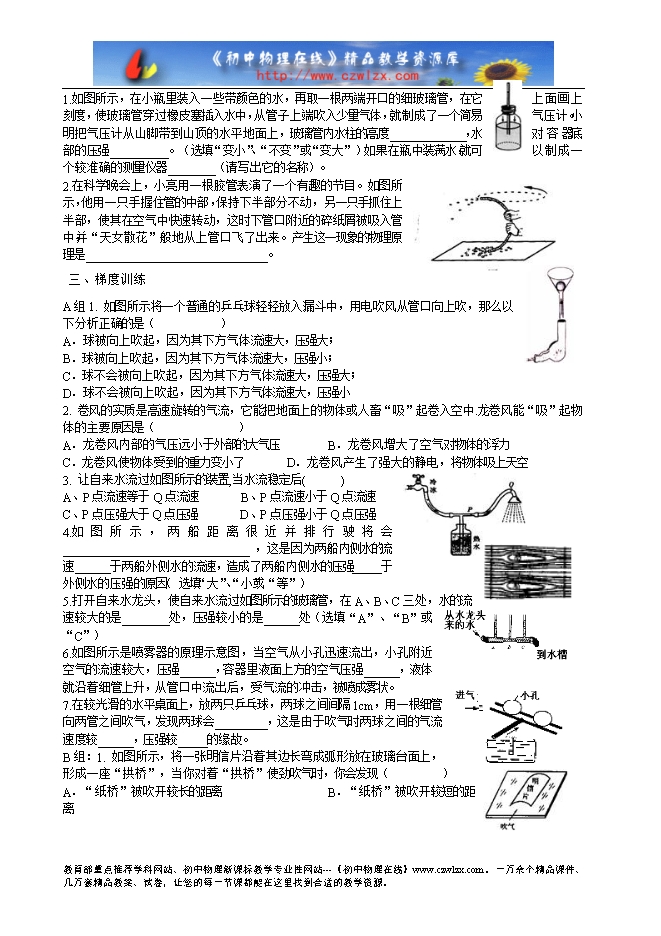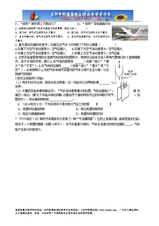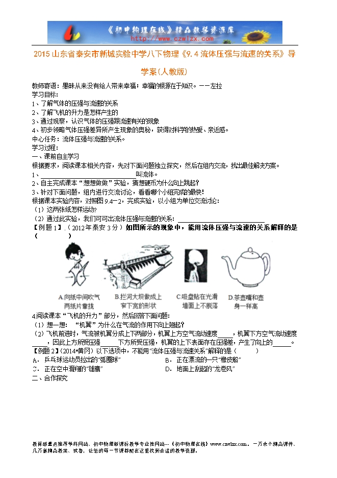 2015山东省泰安市新城实验中学八下物理《9.4流体压强与流速的关系》导学案(人教版)
