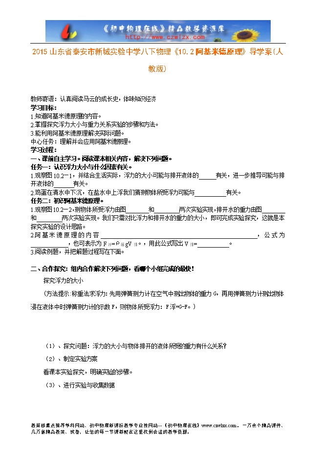 2015山东省泰安市新城实验中学八下物理《10.2阿基米德原理》导学案(人教版)