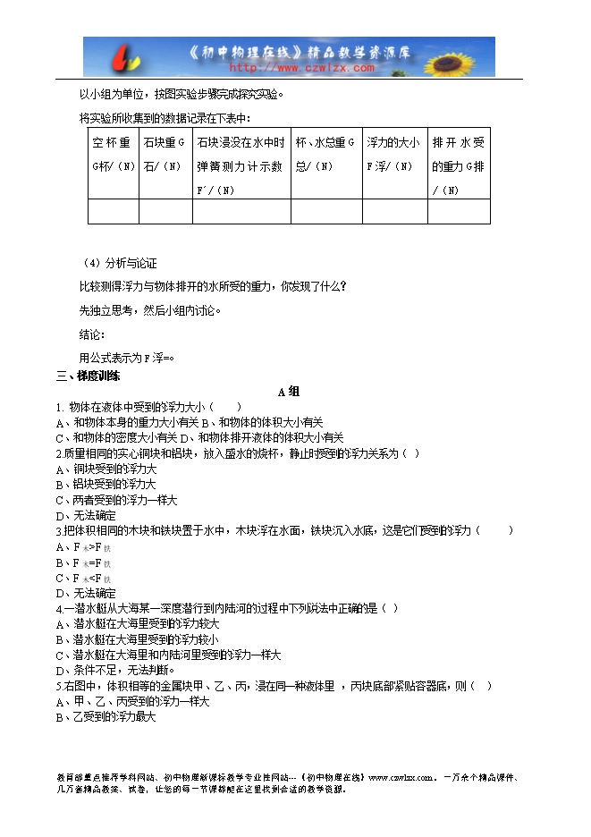 2.阿基米德原理的内容_______________________________________________________,公式为_____________,也可表示为F浮=ρ液gV排。,用此公式写出V排=___________。