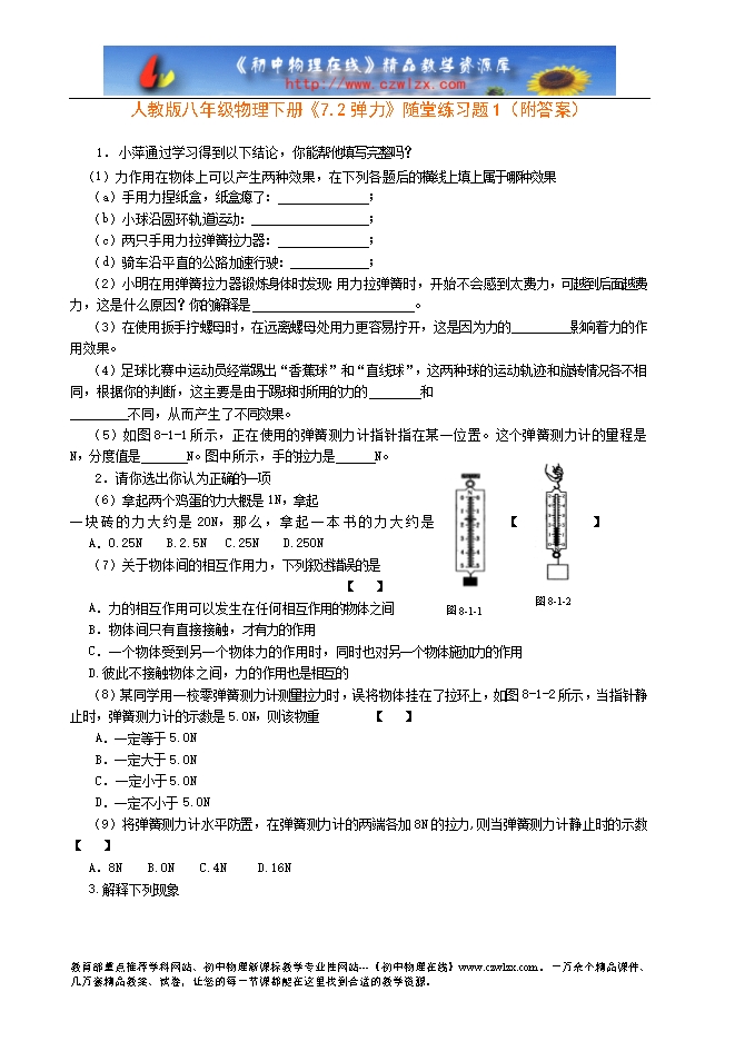 (5)如图8-1-1所示,正在使用的弹簧测力计指针指在某一位置。这个弹簧测力计的量程是 N,分度值是 N。图中所示,手的拉力是 N。