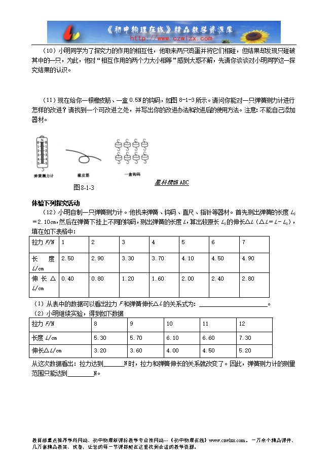 (2)小明在用弹簧拉力器锻炼身体时发现:用力拉弹簧时,开始不会感到太费力,可越到后面越费力,这是什么原因?你的解释是 。