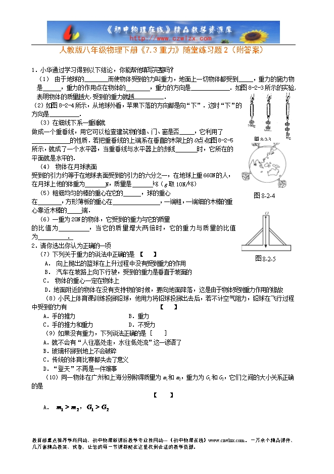 (1) 由于地球的 而使物体受到的力叫重力,地面上一切物体都受到 ,重力的施力物是 ,重力的作用点在物体的 ,重力的方向是_____________.如图8-2-3所示的实验,表明物体的质量越大,受到的重力就越__________.
