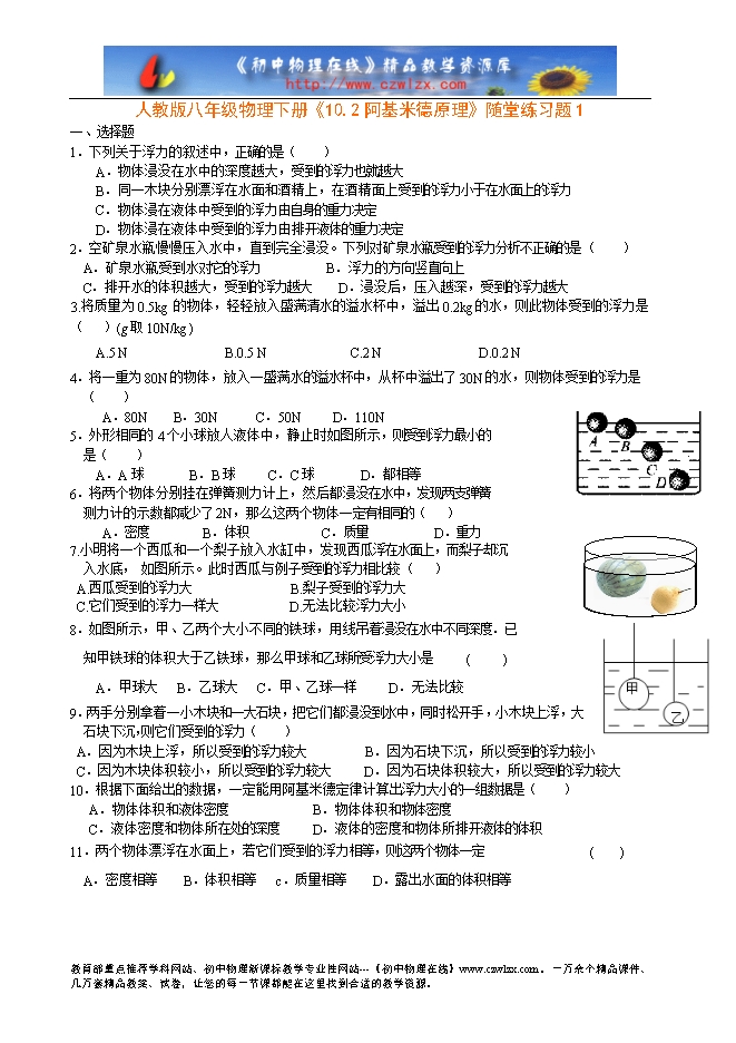 人教版八年级物理下册《10.2阿基米德原理》随堂练习题1