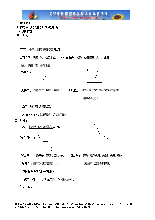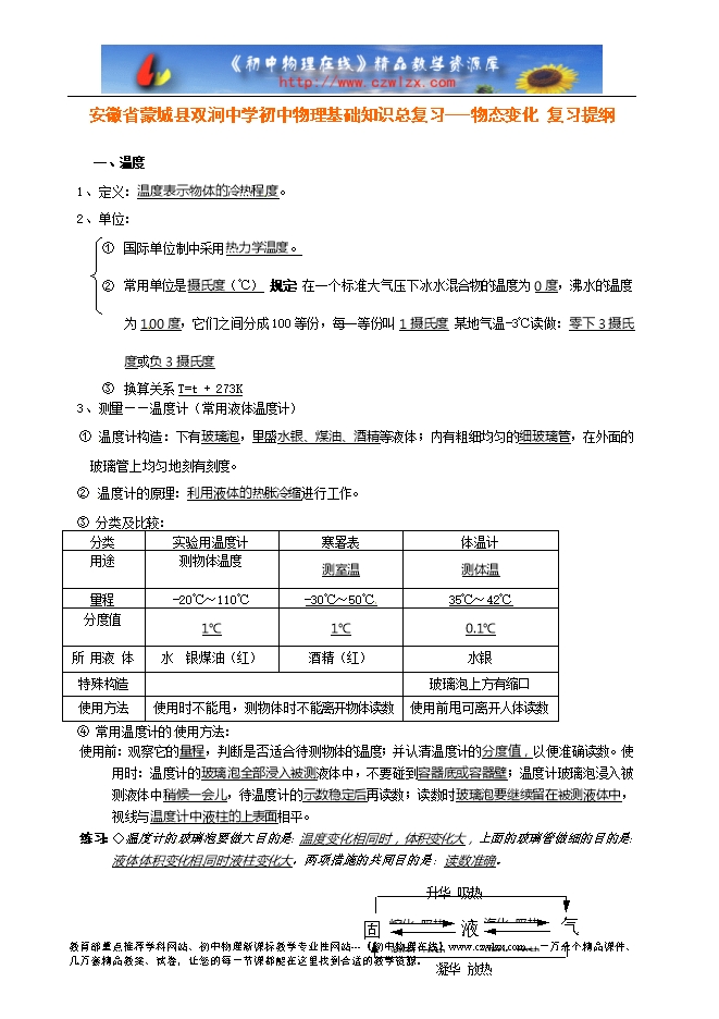 安徽省蒙城县双涧中学初中物理基础知识总复习---物态变化 复习提纲