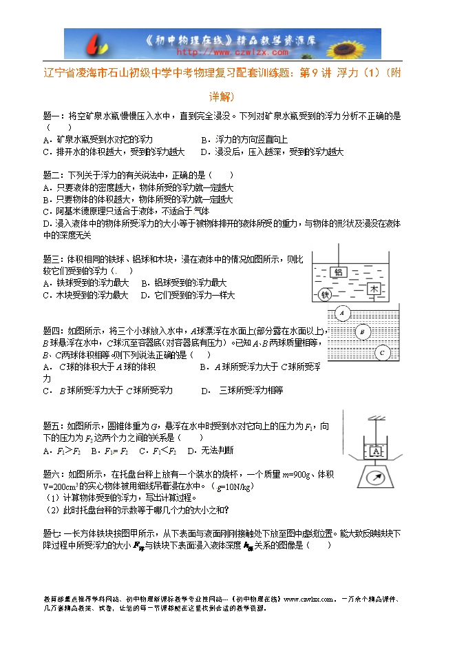 辽宁省凌海市石山初级中学中考物理复习配套训练题:第9讲 浮力(1)(附详解)