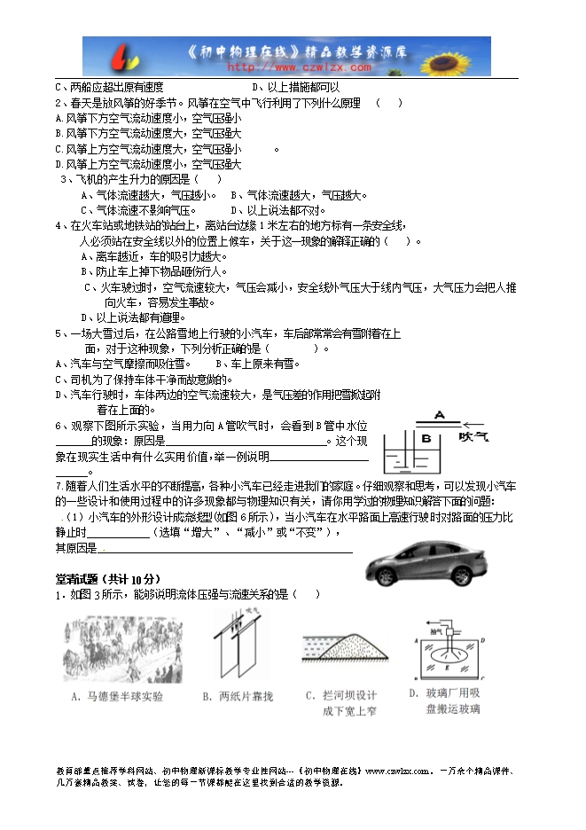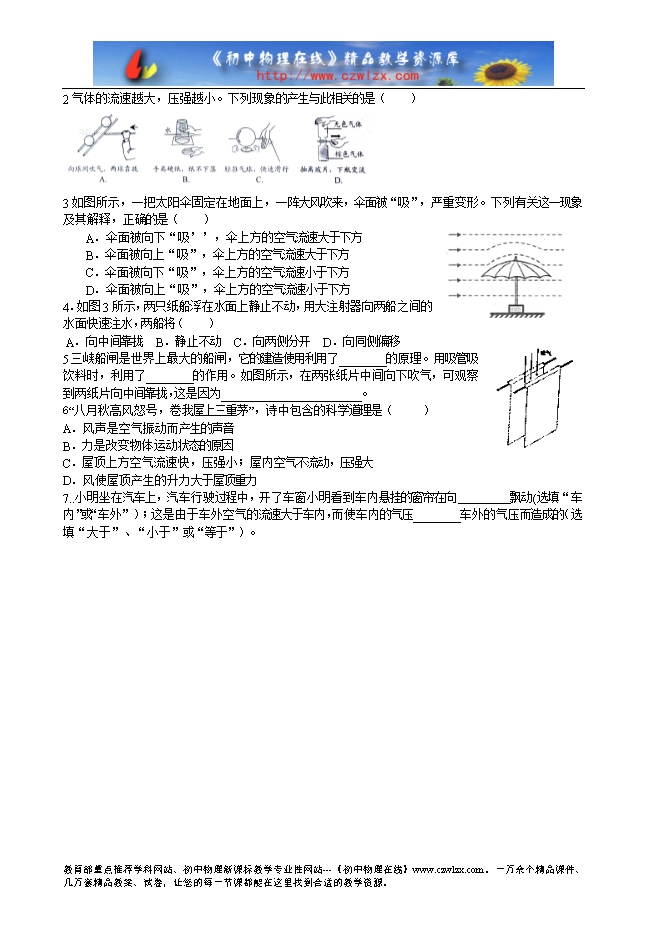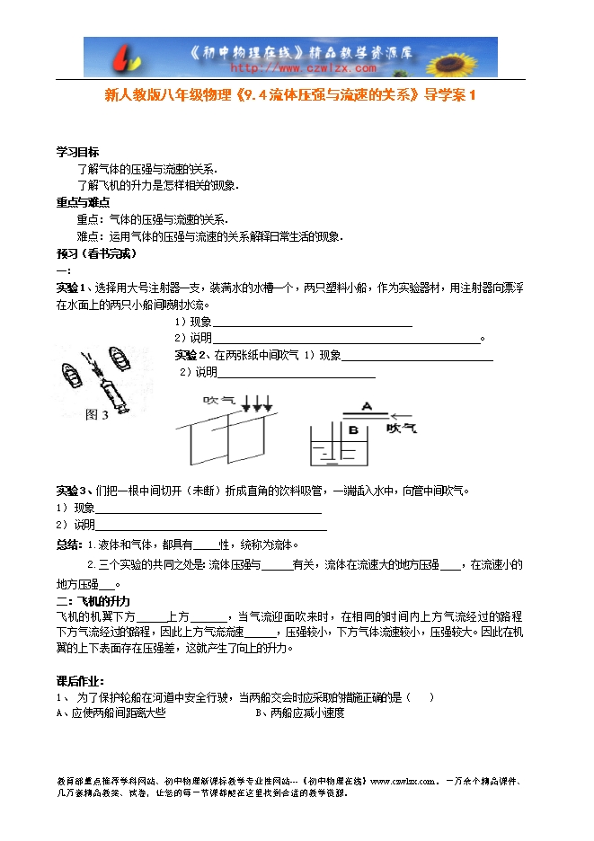 新人教版八年级物理《9.4流体压强与流速的关系》导学案1