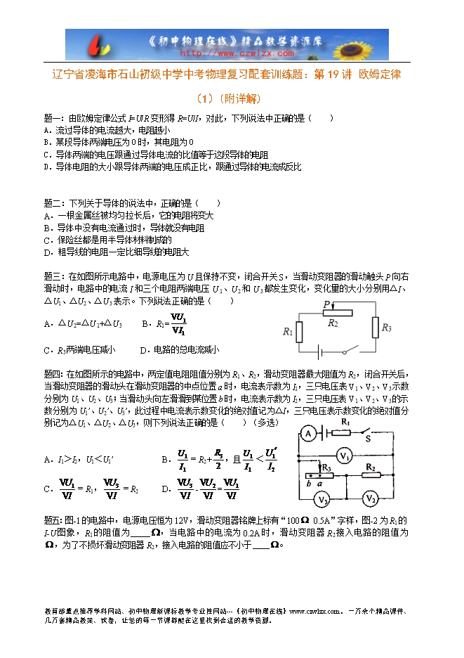 【内容简介】题一:由欧姆定律公式I=U/R变形得R=U/I,对此,下列说法中正确的是( )