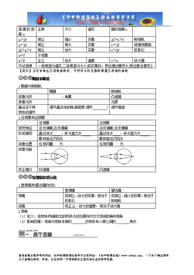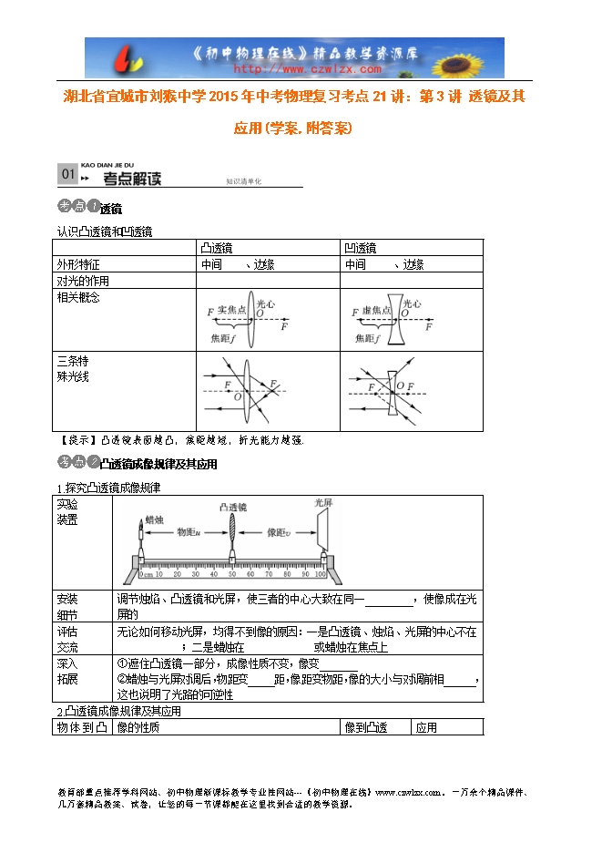 湖北省宜城市刘猴中学2015年中考物理复习考点21讲:第3讲 透镜及其应用(学案,附答案)