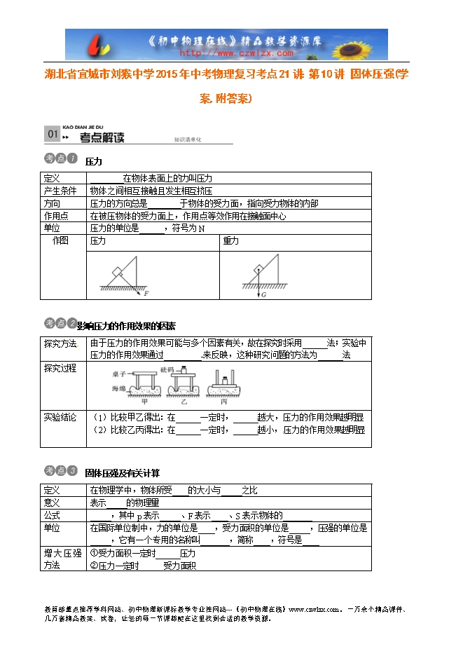 湖北省宜城市刘猴中学2015年中考物理复习考点21讲:第10讲 固体压强(学案,附答案)